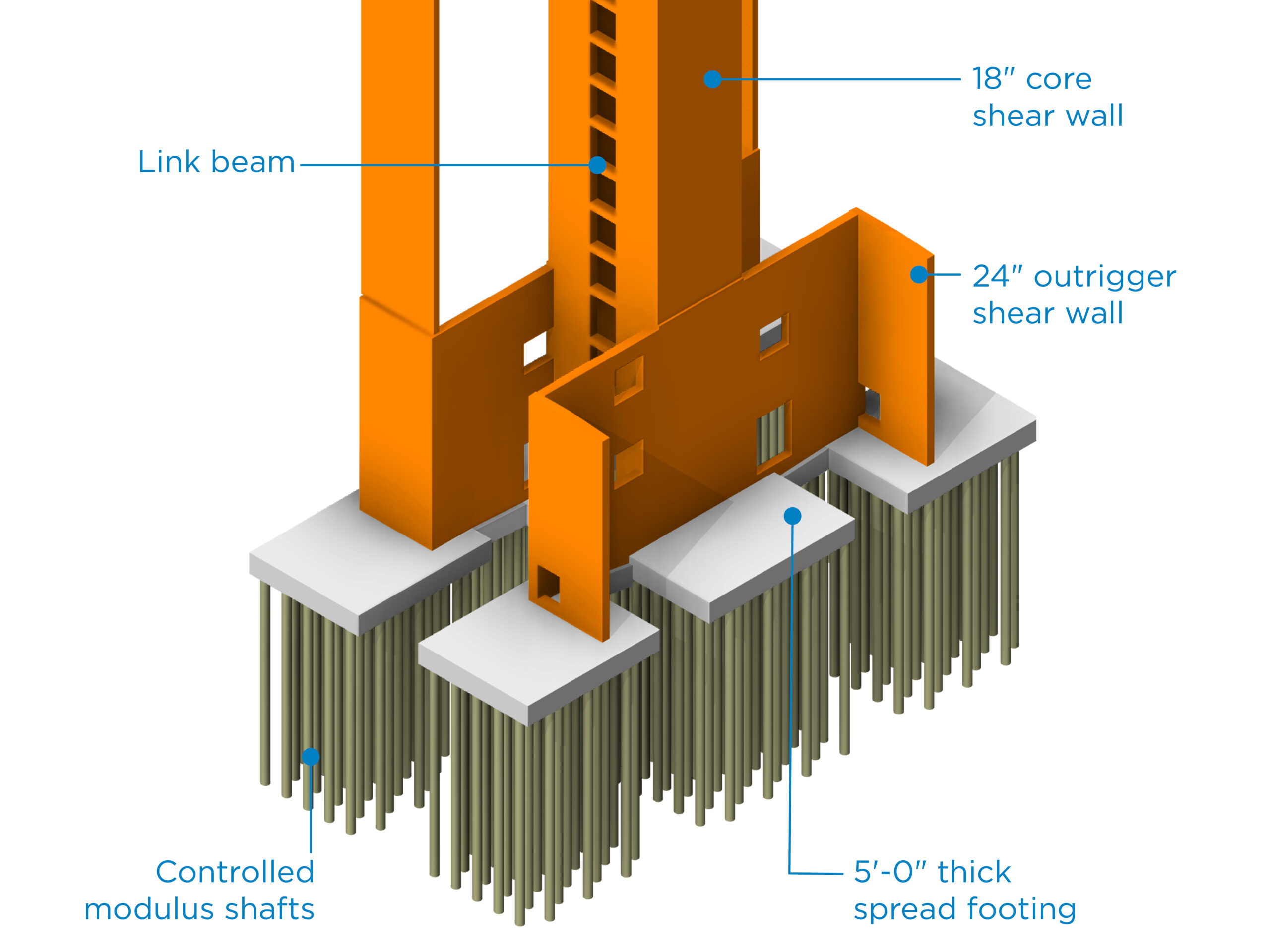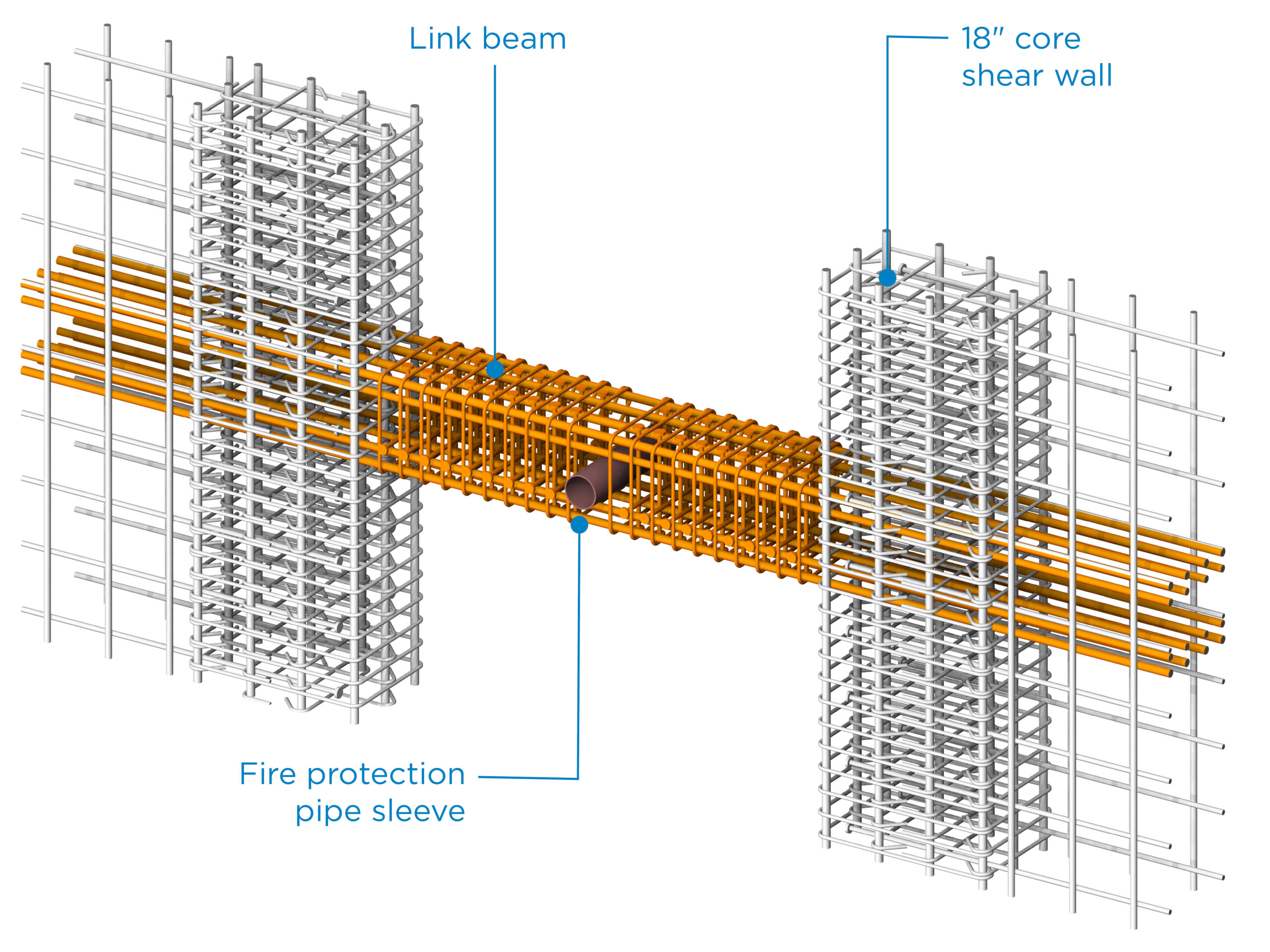 The lateral system consists of a network of ductile concrete shear walls and link beams arranged primarily around the elevator core. As the structure’s floor plate grows below the podium level, the footprint of the concrete walls increases, strategically linking them together and engaging with the gravity frame. When resisting lateral loads imposed on the structure by high winds or ground accelerations during a seismic event, the lateral system gathers a portion of the podium’s self-weight through “outrigger” shear walls to stabilize the more slender lateral system within the tower. The design of the link beams that tie the core walls together was critical to both construction productivity and the structure’s seismic resiliency. In order to achieve economy and simplicity, embedded steel sections were avoided and the beams were kept shallow and lightly reinforced. This makes the link beams relatively flexible and not overly strong, which renders them less prone to seismic damage that would degrade performance and create potential hazards due to falling concrete. It also simplified the construction process, eliminating the need to stage additional trades at each slab, resulting in a reduction in construction time at each floor and a significant cost savings when compared to more conventional strategies.