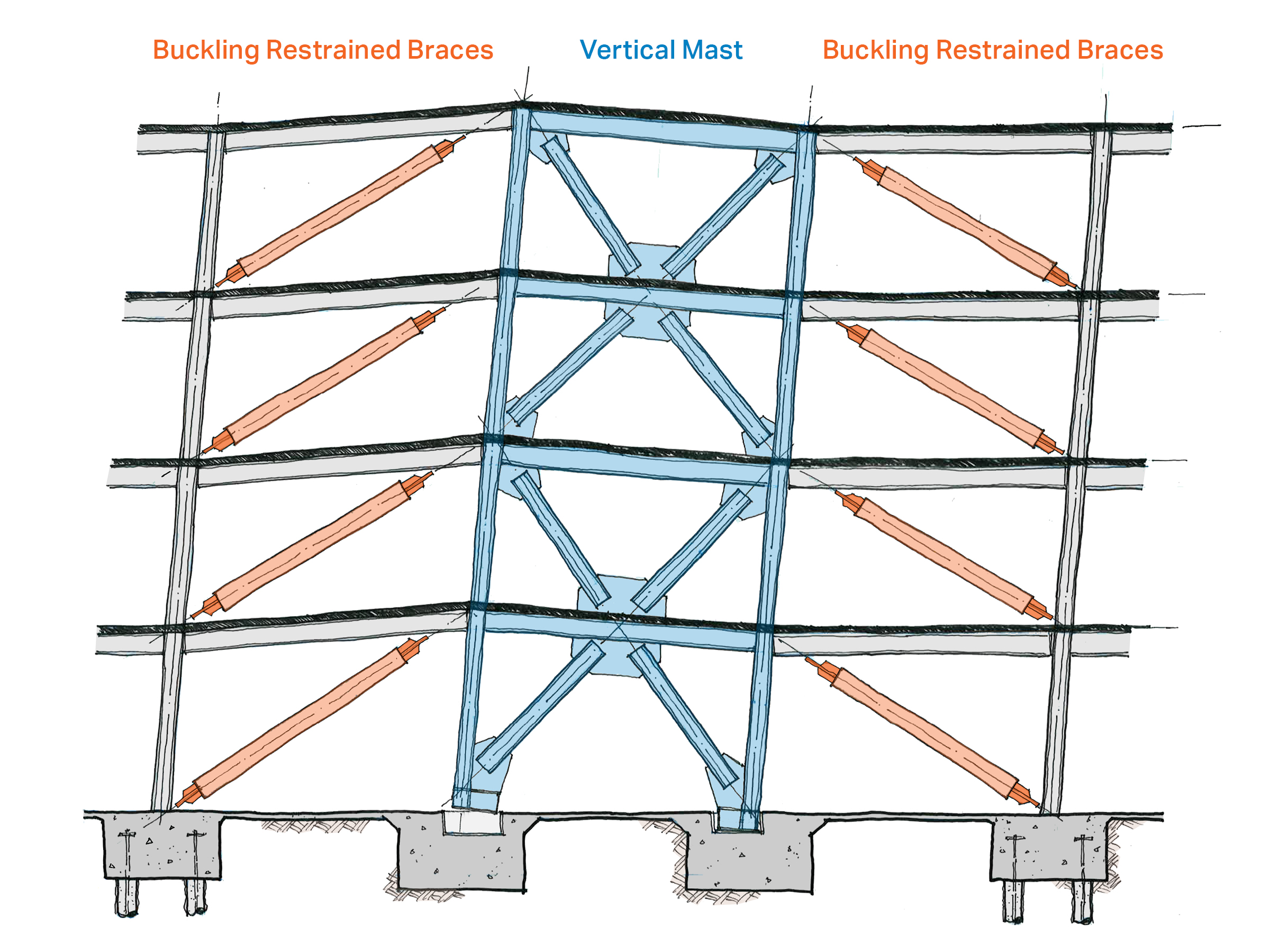 The mast, also referred to as a strong-back, is a vertical truss that extends up the height of the structure, connecting the BRBs to form an integrated framework. This rocking vertical mast is made of conventional steel members and is designed to remain elastic during an earthquake. The mast occupies the same footprint and extent of a conventional frame, but allows for the use of fewer BRB members. By forcing all the BRBs in the system to work together to resist movement at any story, the mast fully mobilizes the BRB elements’ deformation capacity and increases the system’s inherent redundancy.