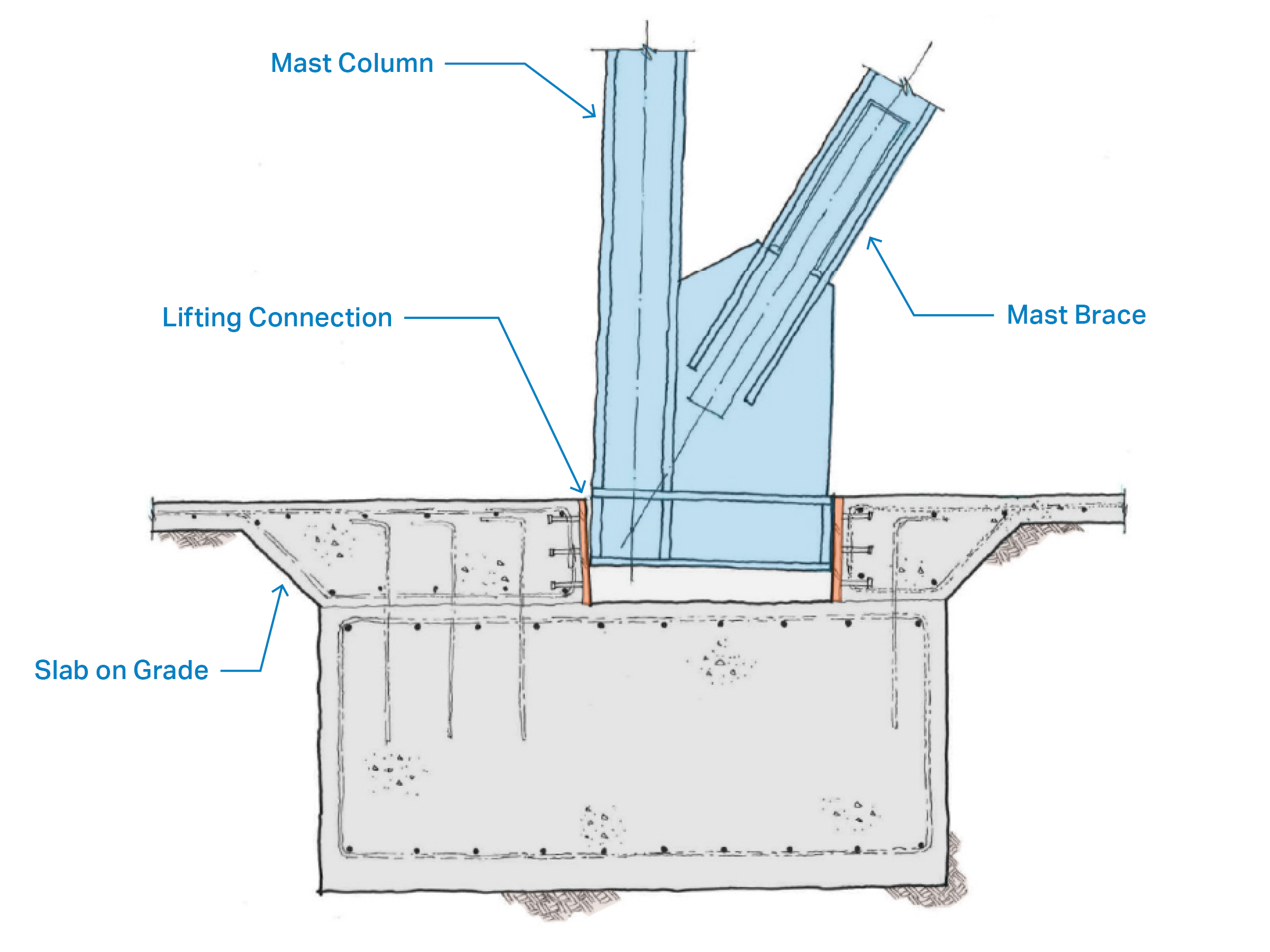 Connections to the foundation elements facilitate rocking behavior by allowing the base of the columns to uplift within a recessed pocket in the spread footing. The mast resists a portion of the design lateral force, but is designed to remain elastic. The yielding BRBs provide all of the ductility and energy dissipation of the system.