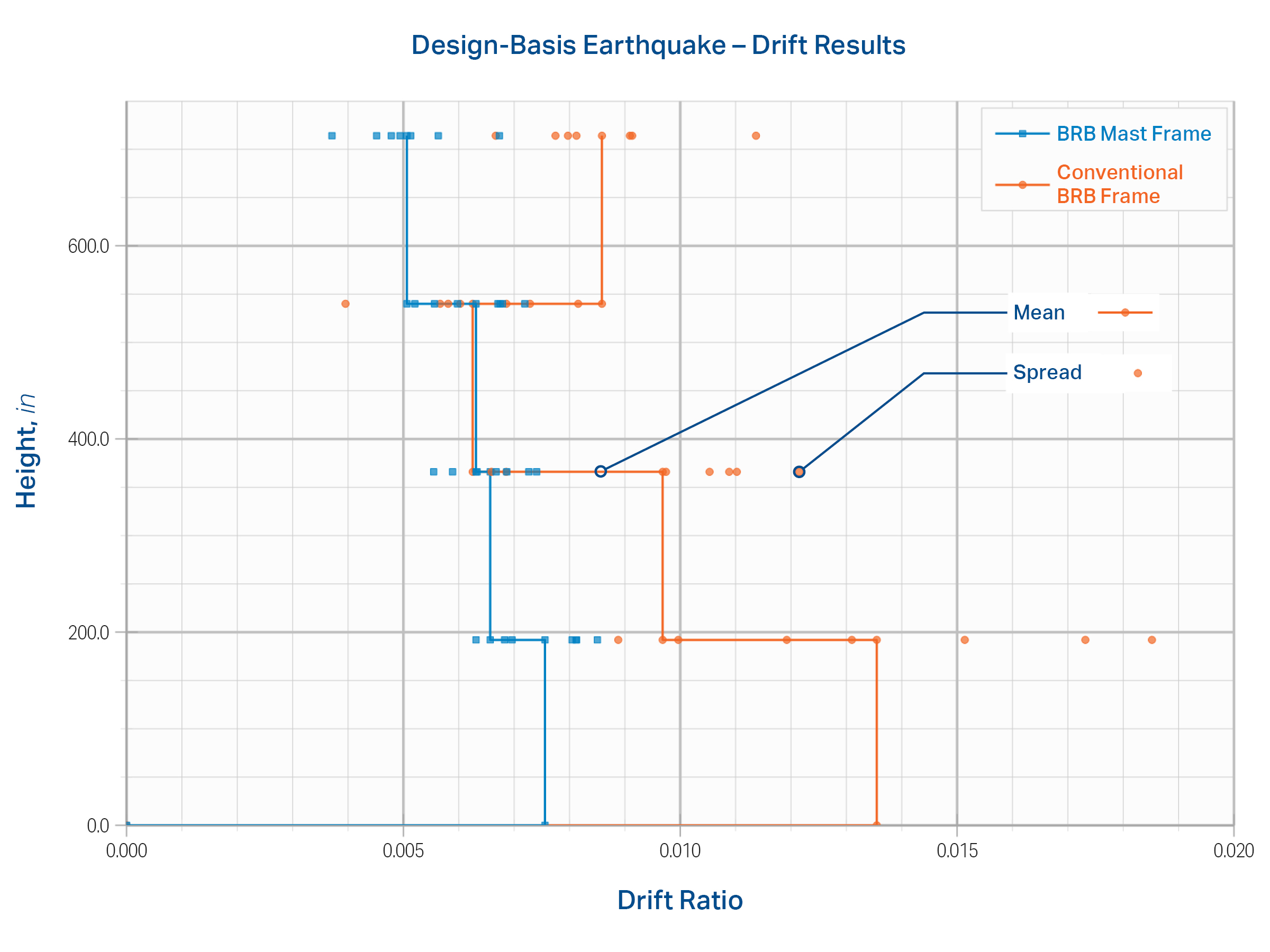 Confirmed through a suite of dynamic performance analyses, the BRB mast frame is far less sensitive to variation in ground motions and results in 50% less story drift and displacement than a conventional SCBF. A plot of the drift response from the nonlinear history analysis demonstrates significantly reduced drifts, a uniform drift profile with no weak stories, and more tightly clustered results, indicating less sensitivity to ground motions.