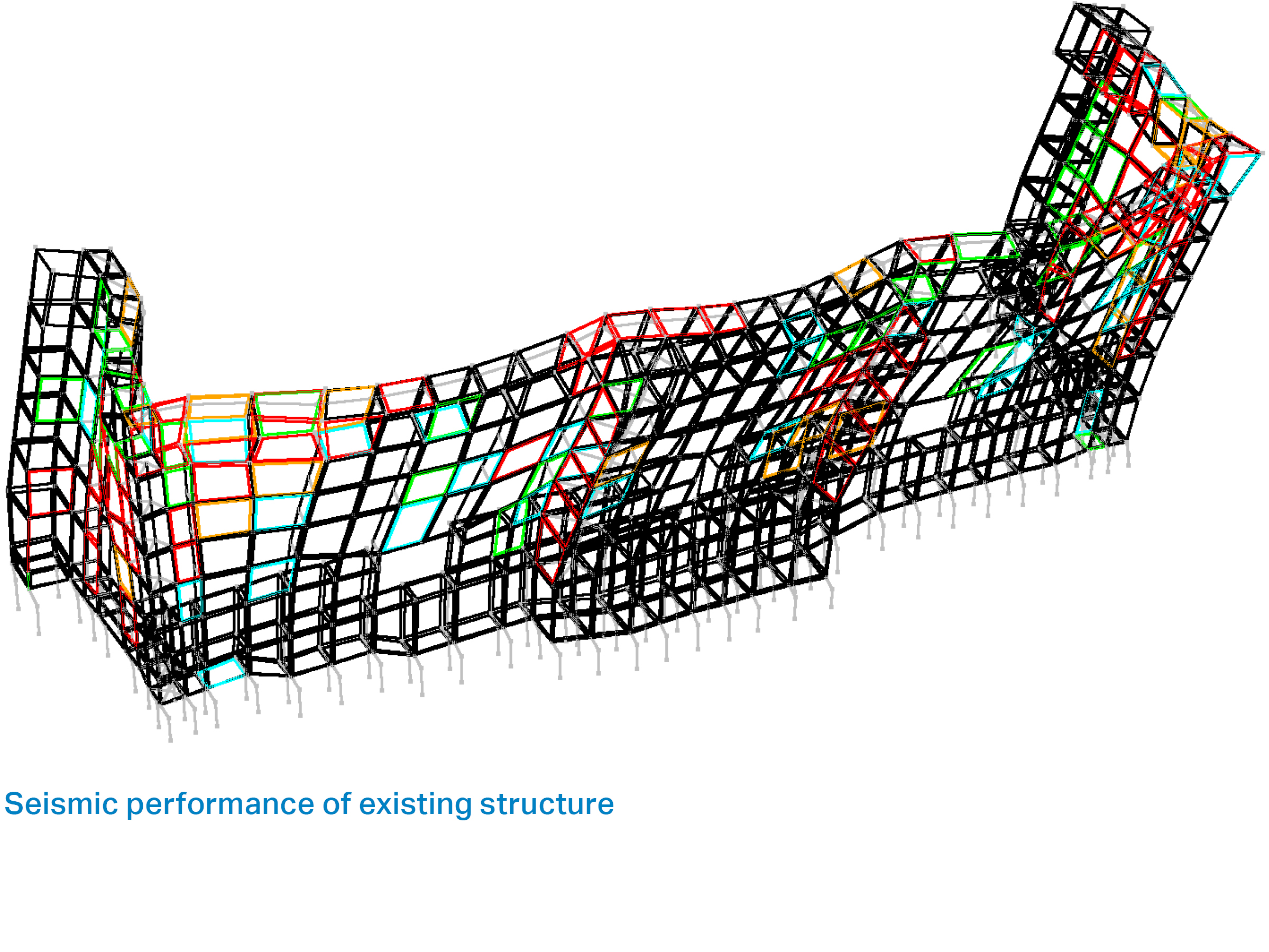Using a sophisticated nonlinear response history analysis with soil-structure interaction, the engineering program stabilized the colonnade as a whole and designed the retrofit in harmony with its natural dynamic modes.