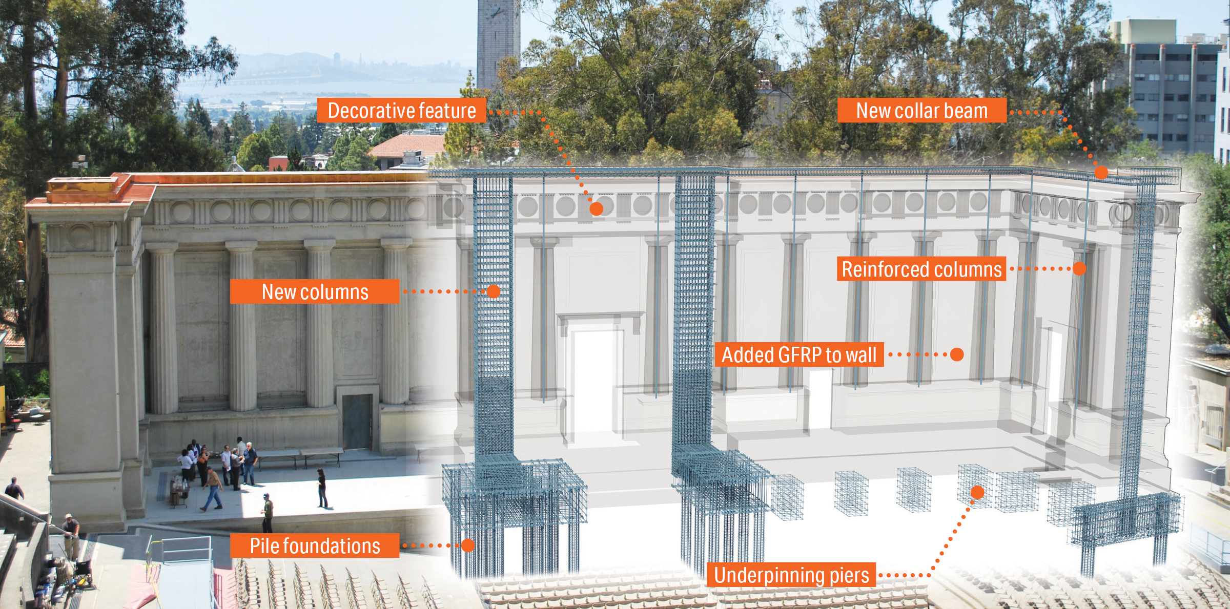 The engineering program’s goal was to stabilize the colonnade as a whole and design the retrofit in harmony with its natural dynamic modes; any significant chunk of concrete that could fall and cause harm would be positively attached to the main mass of the colonnade.