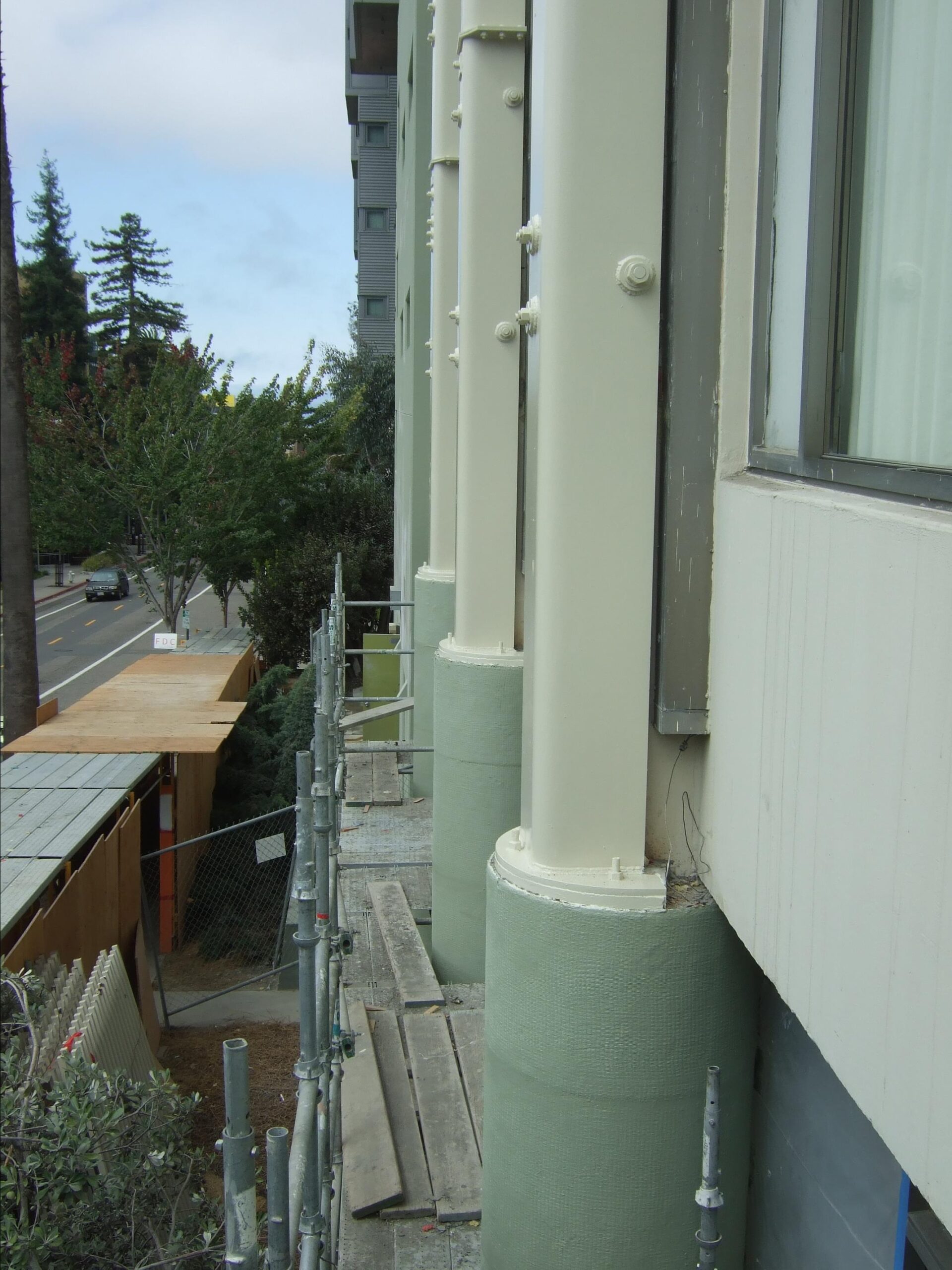 Retrofitting elements designed to strengthen the structures from the outside of the twelve buildings allowed the upgrades to be made while students continued to occupy the building.
