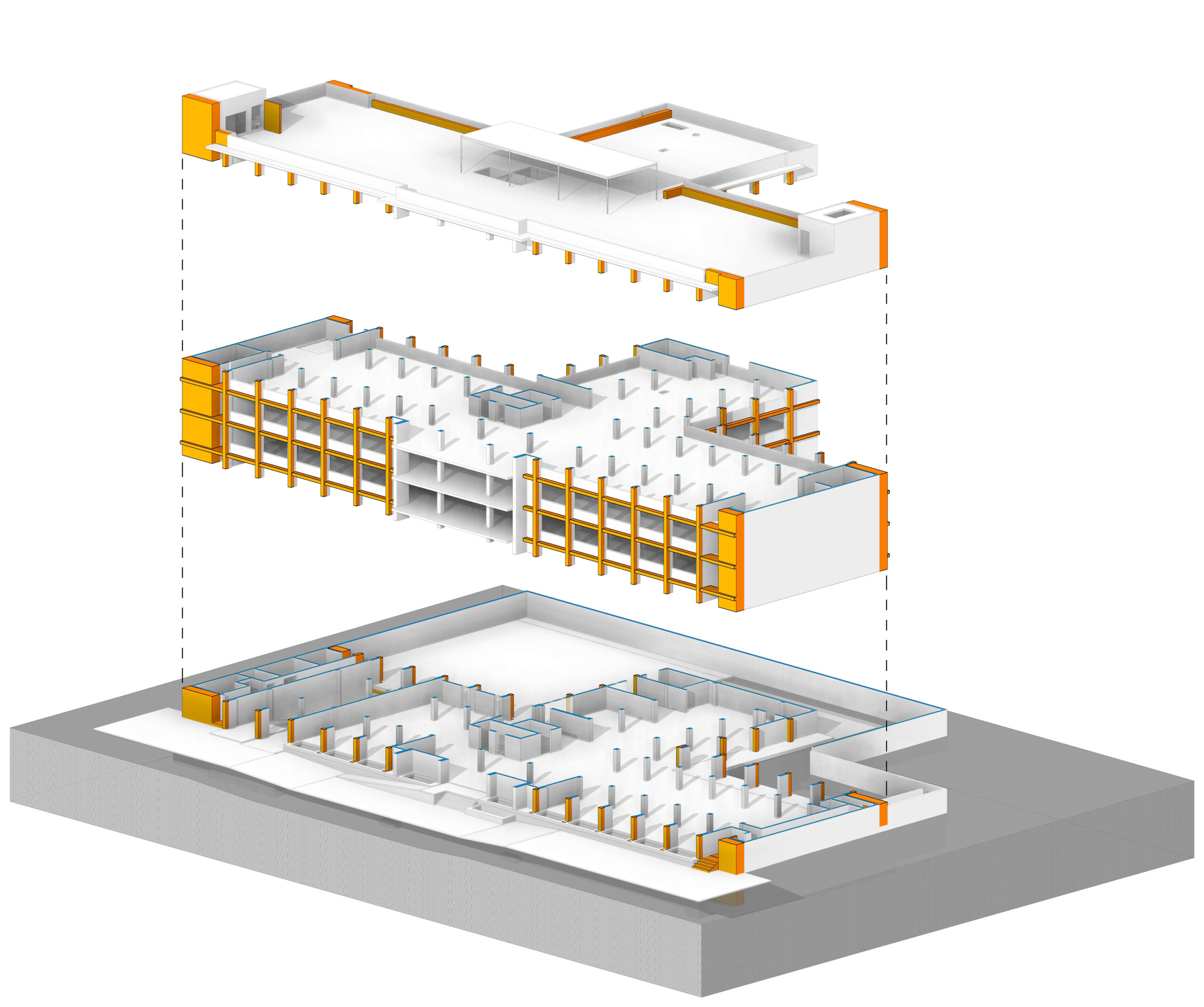 Exploded view of exoskeleton, new shear walls, and collectors